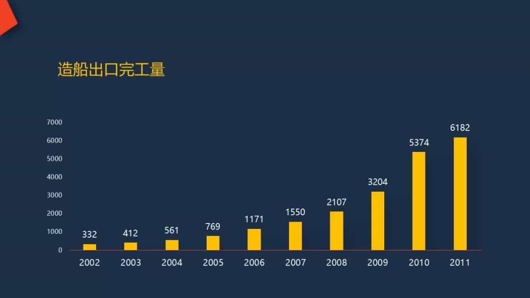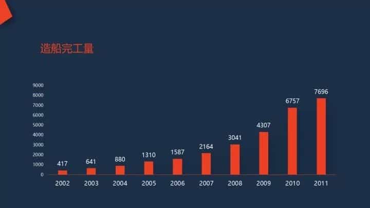 隨著各家企業投資興建大型造船設施的投入使用,中國的造船能力越來越強,造船產量快速增長,2002-2011年間年均增長率達到了38.9%。