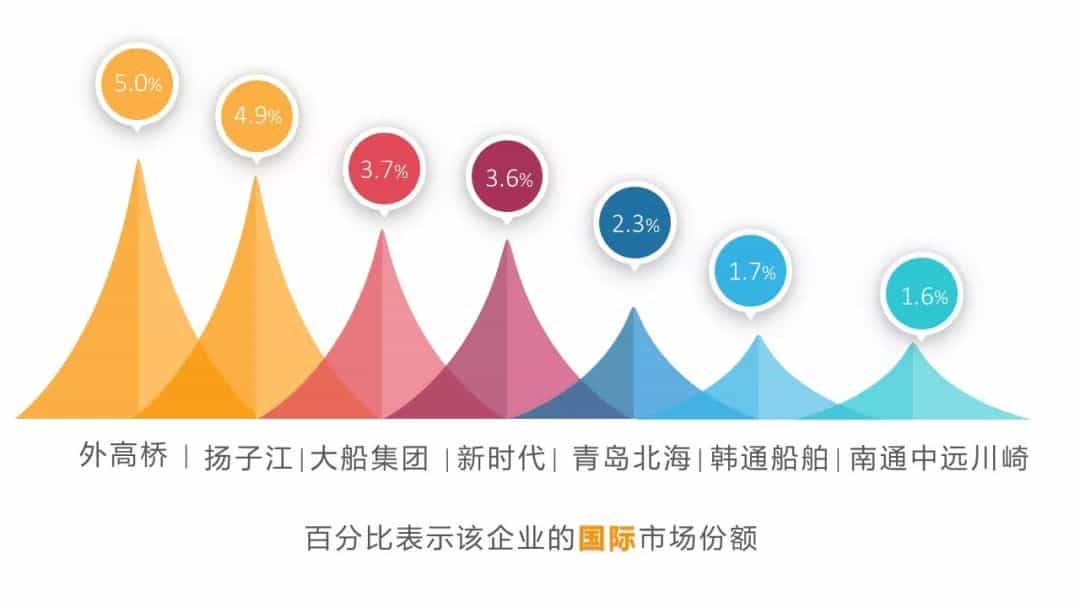 國際市場份額1.5%以上的中國企業中,國有企業3家、民營企業3家、合資企業1家,3家民營企業揚子江、新時代和韓通船舶分別排名第2、第4和第6位,3家企業全球市場份額之和超過了10%。
