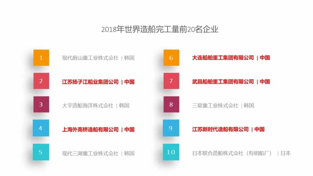 2002年,我國沒有一家企業進入世界前十大造船企業,到2018年,世界前十大造船企業中我國已占有5席。