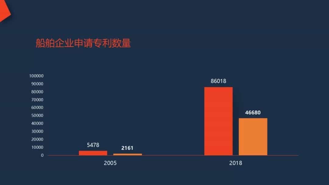 創新是支撐船舶企業轉型升級的主要動力,截止2005年底,我國船舶企業申請專利只有5478件,其中發明專利2161件;截止2018年底,我國船舶企業申請專利已達到86018件,其中發明專利46680件。