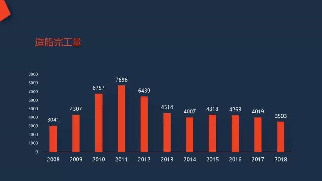 經過不懈努力,在市場總量下降的前提下,2010-2018年,中國造船三大指標世界排名仍保持了連續第一,2018年造船完工量國際市場份額43.6%,手持訂單世界占有率43.0%。