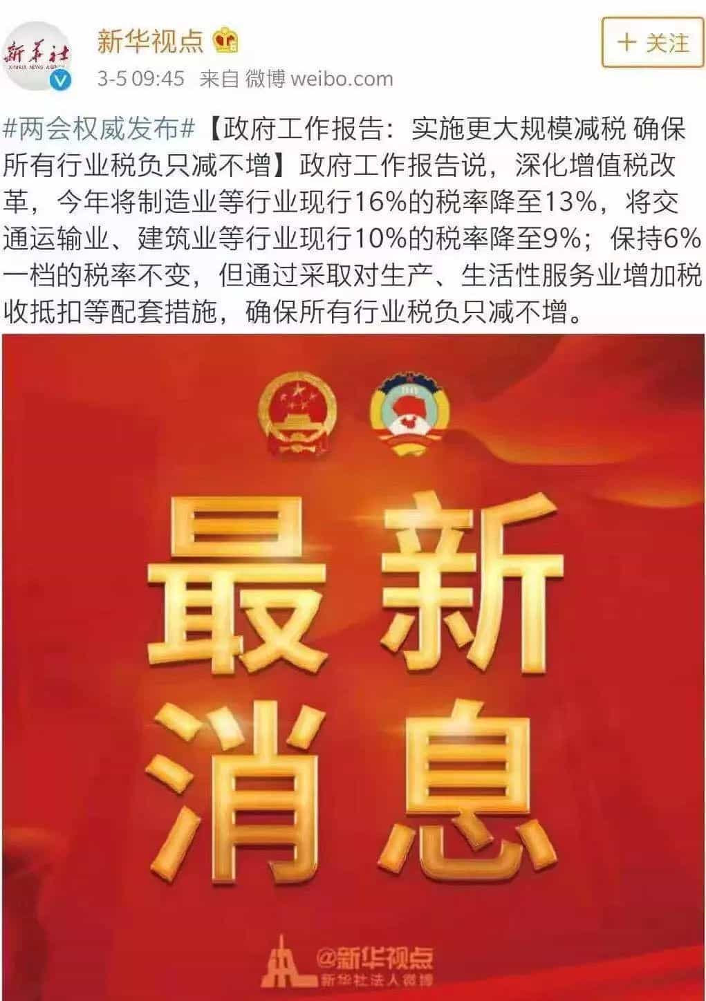 2、降低企業(yè)稅負(fù)。政府工作報(bào)告提出,2019年要實(shí)施更大規(guī)模的減稅,普惠性減稅與結(jié)構(gòu)性減稅并舉,重點(diǎn)降低制造業(yè)和小微企業(yè)稅收負(fù)擔(dān)。財(cái)經(jīng)專家認(rèn)為,其中的重頭戲是增值稅改革。此次調(diào)整后,將變?yōu)?3%、9%與6%三檔。而對于降低制造業(yè)增值稅,雖然此前一直呼吁不斷,但本次3個(gè)百分點(diǎn)的降幅遠(yuǎn)超預(yù)期。