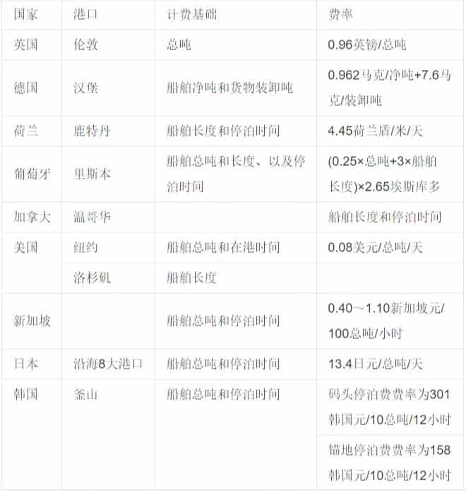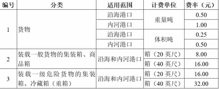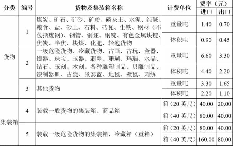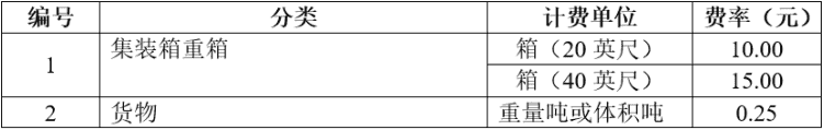 注:1.20英尺重箱和40英尺重箱以外的其它非標準集裝箱按相近箱型的費率計費。2.集裝箱拼箱貨物按貨物的實際重量噸或體積噸分攤港口設施保安費。
