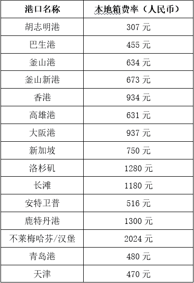 國內外各港20英尺集裝箱裝卸船部分的費率(元/箱)