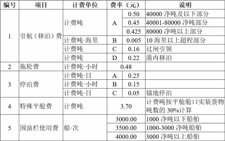 實行政府指導價的港口收費包括引航(移泊)費、拖輪費、停泊費、駁船取送費、特殊平艙費和圍油欄使用費。