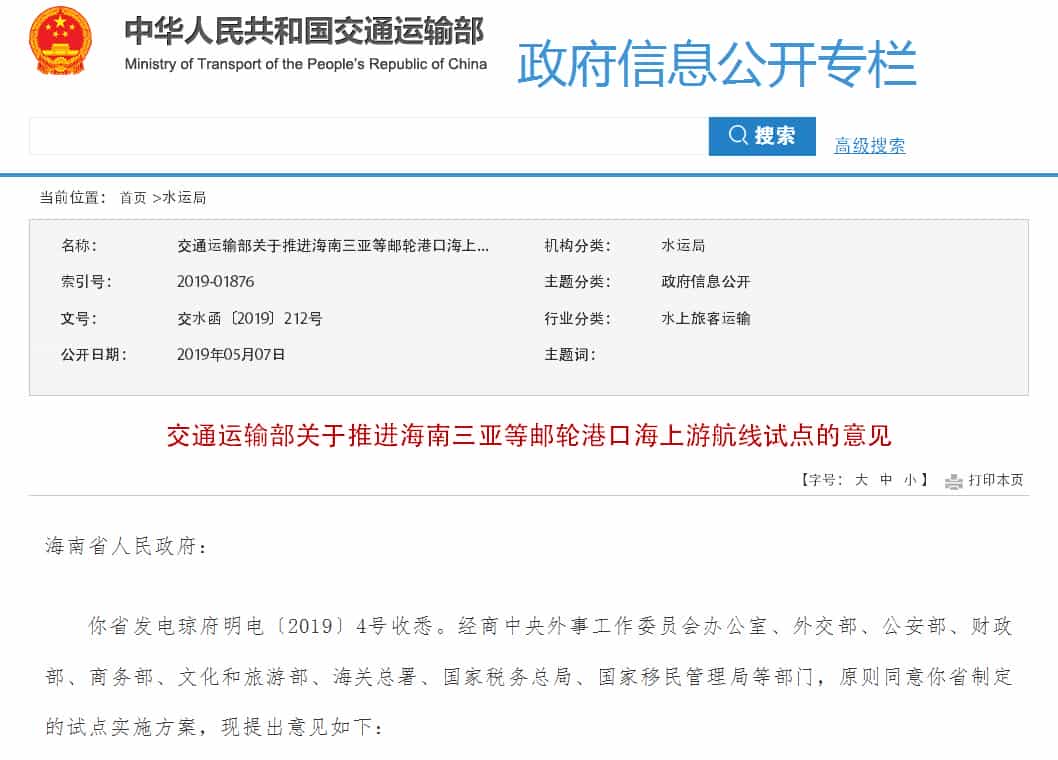 5月7日,交通運(yùn)輸部發(fā)布《關(guān)于推進(jìn)海南三亞等郵輪港口海上游航線(xiàn)試點(diǎn)的意見(jiàn)》。
