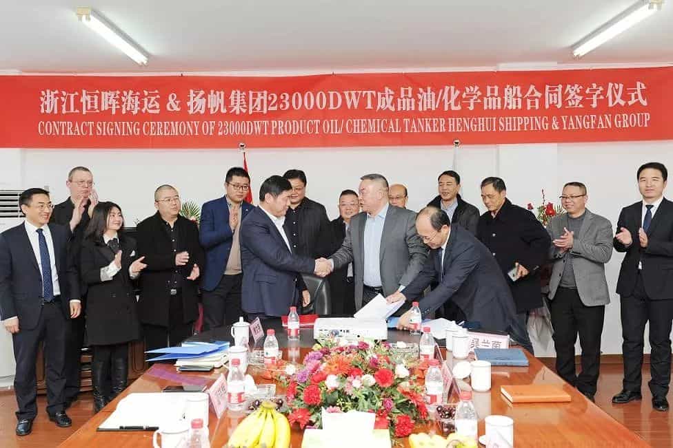 2020年1月1日,揚(yáng)帆集團(tuán)與浙江恒暉海運(yùn)簽署了一艘23,000噸級(jí)成品油兼化學(xué)品船建造合同。該船型總長159.20米,型寬24.80米,型深13.85米,結(jié)構(gòu)吃水9.80米,最大23,000載重噸,液貨艙艙容達(dá)27,000立方米。該船可裝載輕汽油、柴油、2類化學(xué)品等貨品。