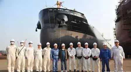 4月9日,新?lián)P子造船為保加利亞國航建造的第五艘45000DWT散貨船在船臺東線順利下水。