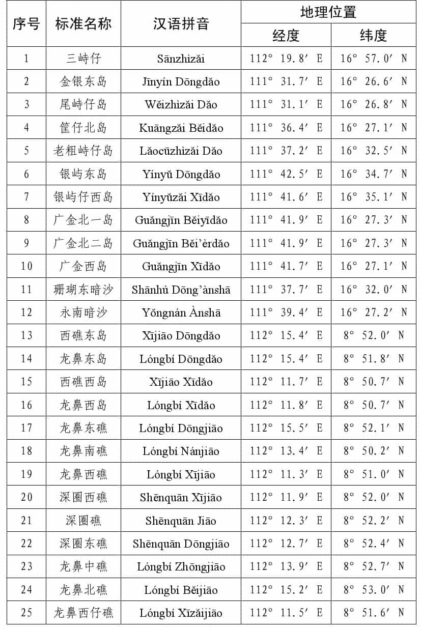 公告稱,為進一步規范有關地名的使用,現將我國南海部分島礁和海底地理實體的標準名稱予以公布。中國地名委員會1983年4月受權公布的《我國南海諸島部分標準地名》繼續有效,請社會各界規范使用已公布的標準名稱。