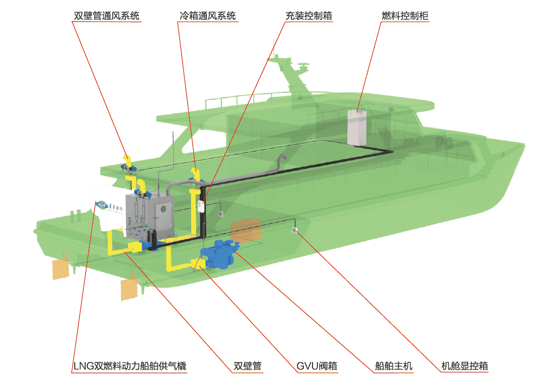 LNG單燃料動力船舶供氣系統設兩路獨立供氣系統,確保一路供氣系統出現故障時,不影響另一路供氣系統運行;LNG雙燃料動力船舶供氣系統設一路獨立供氣系統(雙燃料動力系統自帶冗余系統)。