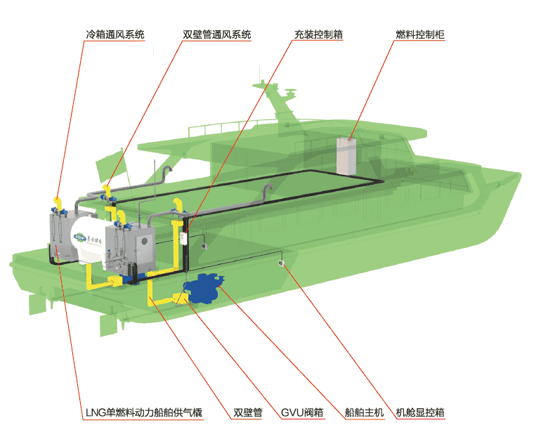 LNG供氣系統(FGSS)可分為LNG單燃料動力船舶供氣系統和LNG雙燃料動力船舶供氣系統。供氣系統由儲罐連接處所和儲罐組成,集儲罐充裝補液,儲罐壓力調節,LNG燃料供氣,安全排放,通風等多功能于一體,實現對天然氣發動機及發電機穩定供氣。