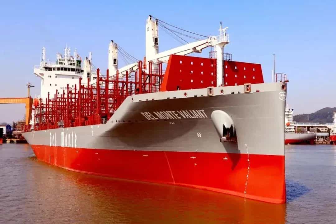 下午,黃埔文沖交付為美國DEL MONTE 公司建造的600FEU全冷箱集裝箱5#船(H5546)“DEL MONTE VALIANT”輪。