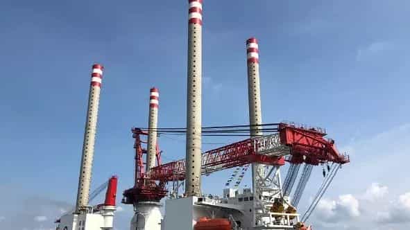“振江”號為振江股份子公司尚和海工所屬,是當時國內(nèi)首座1200噸自行自升式風電安裝平臺,可獨立完成6MW、8MW級風機的安裝和其他水上工程施工的起重、打樁、吊裝和運輸?shù)茸鳂I(yè)。