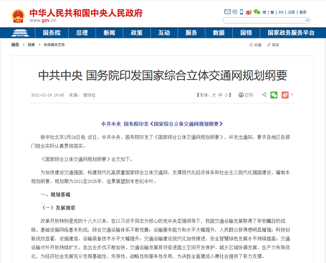 據新華社2月24日報道,近日,中共中央、國務院印發了《國家綜合立體交通網規劃綱要》(簡稱綱要),提出了從2021年到2035年,我國構建現代化高質量國家綜合立體交通網的遠景規劃。