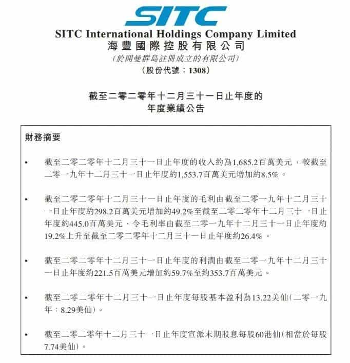 海豐國際公布的2020年業績報告顯示,全年共實現收入16.852億美元,同比增長8.5%。利潤達到3.537億美元,同比增長59.7%。其中,集裝箱航運物流板塊收入為16.62億美元,同比增長約8.9%。海豐國際表示,集裝箱航運物流板塊業績增長,主要由于貨運量增加及平均運費的提升。2020年,該公司集裝箱貨運量為2,614,203個標準箱,同比增長5.3%。平均運費(不包括互換倉位費收入)達到545.1美元/標準箱,同比增長約1.6%。