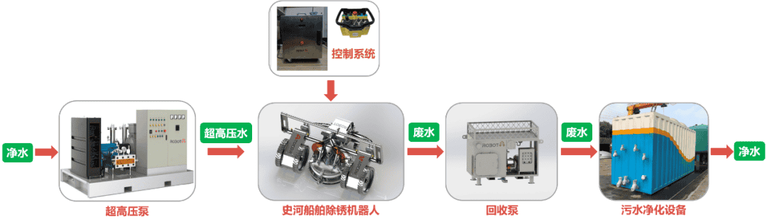 整套作業系統的淡水由工業水管(或淡水儲存倉)供給,通過超高壓泵加壓,加壓后的超高壓水接到史河船舶除銹機器人的本體回收盤,操作人員在地面通過遙控器,遠程控制機器人進行超高壓除銹作業。作業產生的廢水通過真空回收泵回收至污水倉,經污水凈化設備凈化處理后,再通過管線連接回供水端,反復利用。