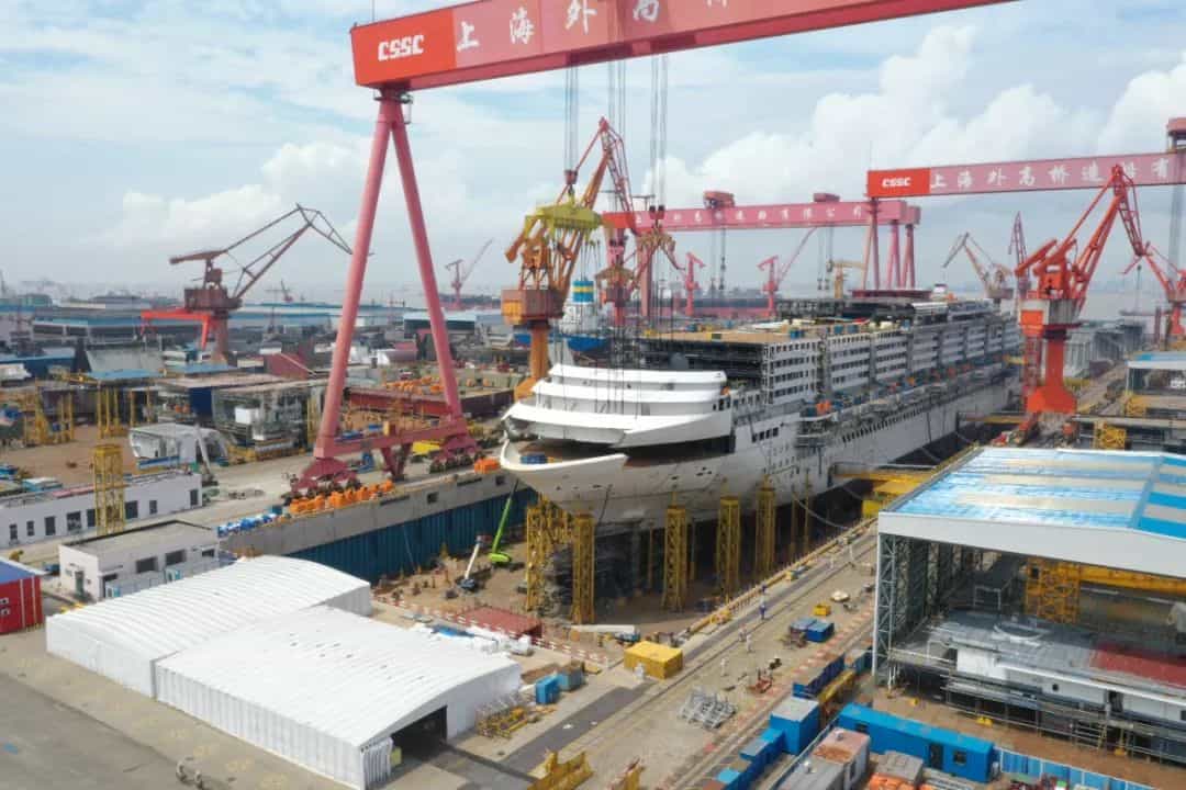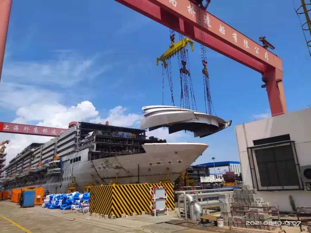 中國首制大型郵輪開啟船艏部位吊裝模式