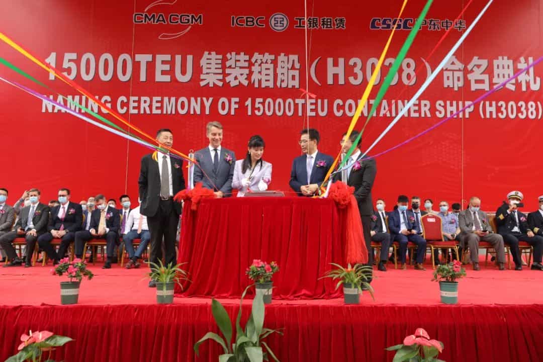 近日,由中國船舶集團有限公司旗下滬東中華造船(集團)有限公司為法國達飛海運集團建造的15000TEU超大型集裝箱系列船首制船“達飛·和風”(CMA CGM ZEPHYR)號在上海命名交付。