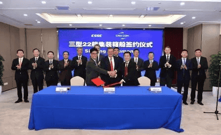 近年來,中國船舶集團與法國達飛集團戰略合作碩果累累。2017年9月,雙方簽訂了9艘全球首創最大、最先進23000TEU雙燃料動力集裝箱船建造合同。今年4月,雙方再度攜手,簽訂了6艘15000TEU雙燃料動力集裝箱船、6艘13000TEU雙燃料動力集裝箱船和10艘5500TEU常規動力集裝箱船等共3型22艘集裝箱船建造訂單,刷新了中國船舶集團承接單筆金額最大的集裝箱船訂單紀錄,法國達飛集團也成為中國船舶集團在集裝箱船領域全球最大的合作伙伴。