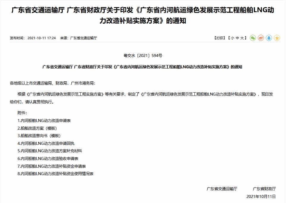 近日,廣東省交通運輸廳、廣東省財政廳正式發布《廣東省內河航運綠色發展示范工程船舶LNG動力改造補貼實施方案》(簡稱《方案》)。廣東省將安排補貼資金約5.5億元擬對300艘符合條件的船舶進行液化天然氣(LNG)動力改造補貼,推動內河航運綠色發展,推進LNG動力船舶應用。