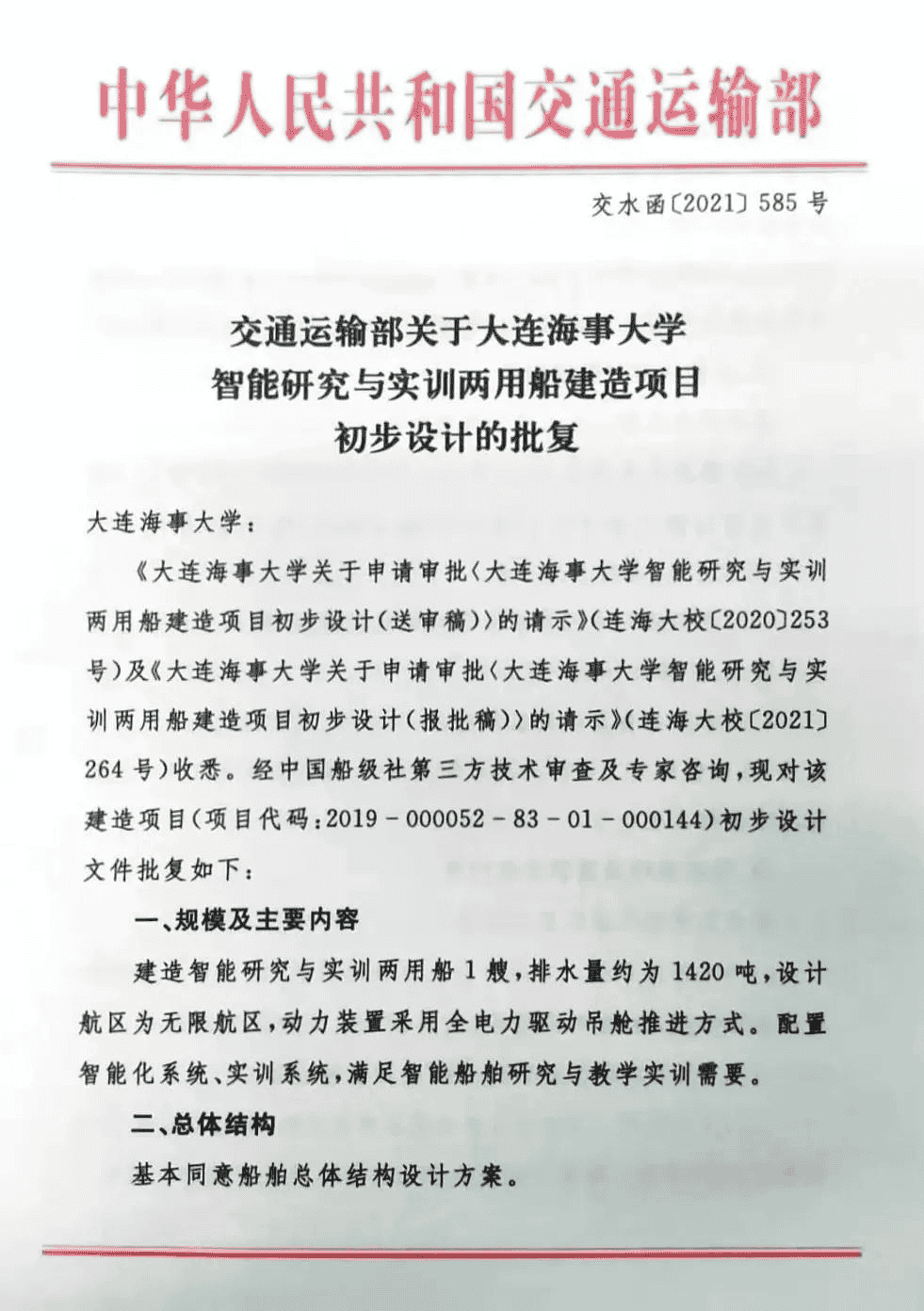 近日,交通運輸部正式批復大連海事大學1艘“智能研究與實訓兩用船”建造項目初步設計,該船建造工程概算為1.2743億元。2019年7月,大連海事大學“智能研究與實訓兩用船”建造項目建議書獲國家發展改革委批復;次年6月,該船建造項目可行性研究報告獲發展改革委批復。