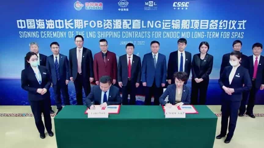 1月7日,“中海油中長(zhǎng)期FOB資源配套LNG運(yùn)輸船項(xiàng)目”簽約儀式在北京、上海和日本東京以視頻連線方式舉行。中國(guó)船舶集團(tuán)有限公司旗下滬東中華造船(集團(tuán))有限公司和中國(guó)船舶工業(yè)貿(mào)易有限公司作為聯(lián)合賣方,與買方日本商船三井株式會(huì)社通過(guò)“云簽約”方式,正式簽訂6艘全球最新一代“長(zhǎng)恒系列”17.4萬(wàn)立方米液化天然氣(LNG)運(yùn)輸船建造合同,金額約75億元人民幣。