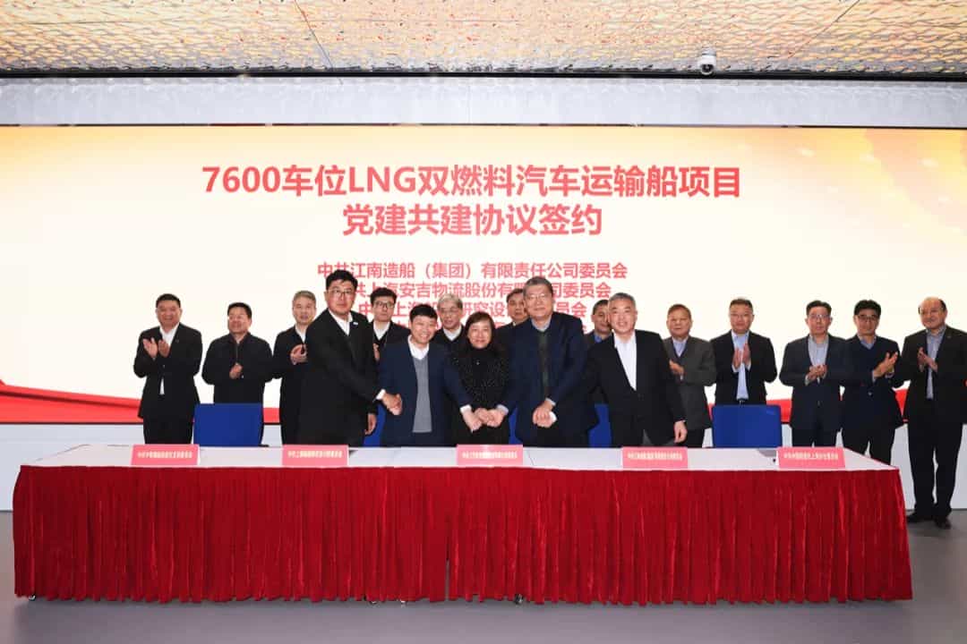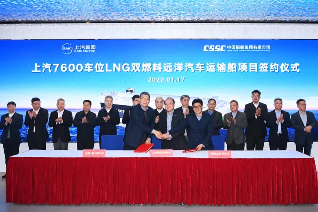 1月17日,中國船舶集團有限公司旗下江南造船(集團)有限責任公司聯合中國船舶工業貿易有限公司與上海汽車集團股份有限公司旗下上汽安吉物流股份有限公司正式簽訂2艘7600車雙燃料動力汽車運輸船(PCTC)建造合同。