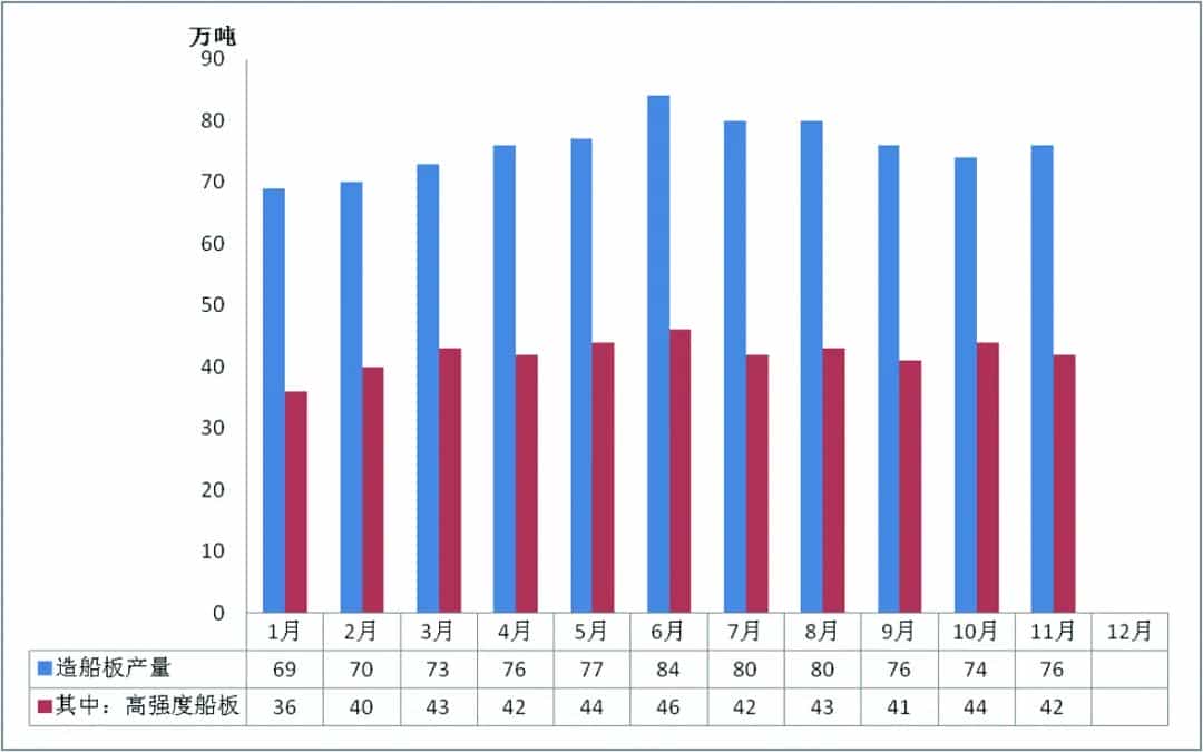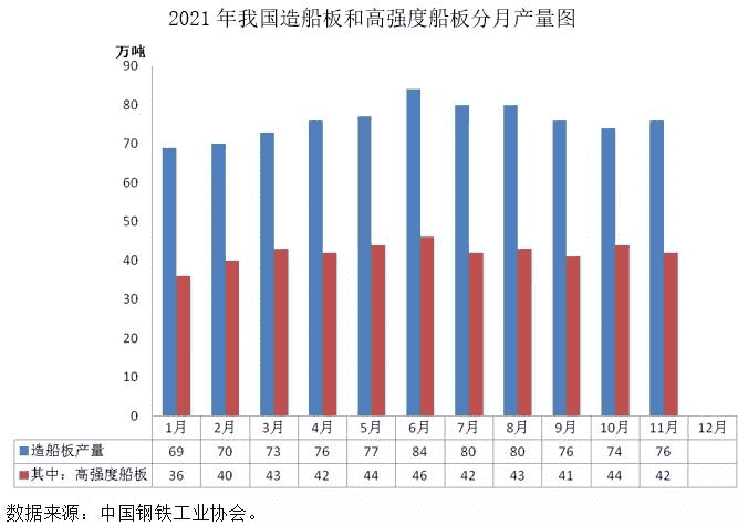 2021年,我國鋼鐵企業造船板產量呈現先抑后揚態勢。分季度看,一季度造船板月均產量71萬噸,第二、三、四季度月均產量均保持在80萬噸左右。骨干鋼鐵企業持續加大生產力度,全力滿足船廠需求。