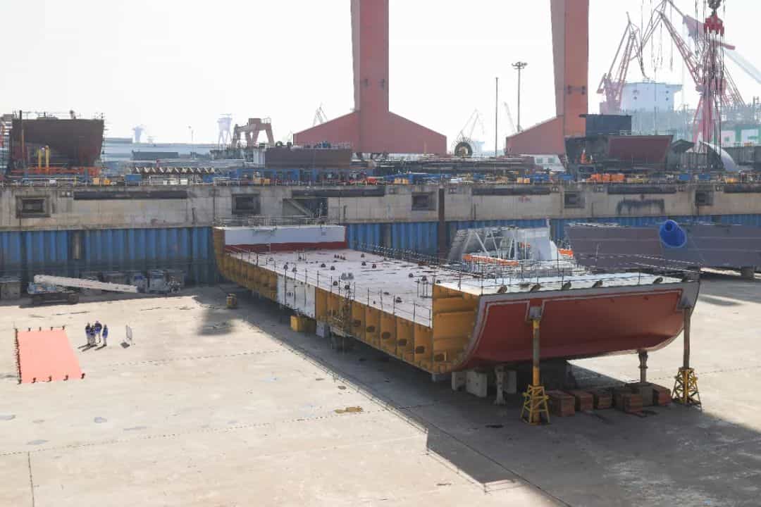 2月14日,中國船舶集團(tuán)有限公司旗下滬東中華造船(集團(tuán))有限公司建造的全球最大24000TEU超大型集裝箱船7號船在中船長興造船基地2號船塢順利入塢搭載。