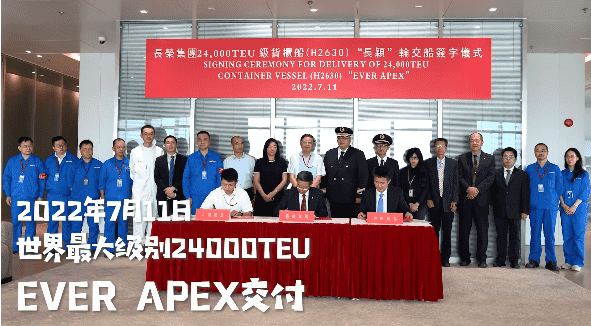 7月11日,江南造船聯合中船貿易,為長榮海運建造的--全球最大24000TEU集裝箱船“長穎(EVER APEX)”號正式交付。