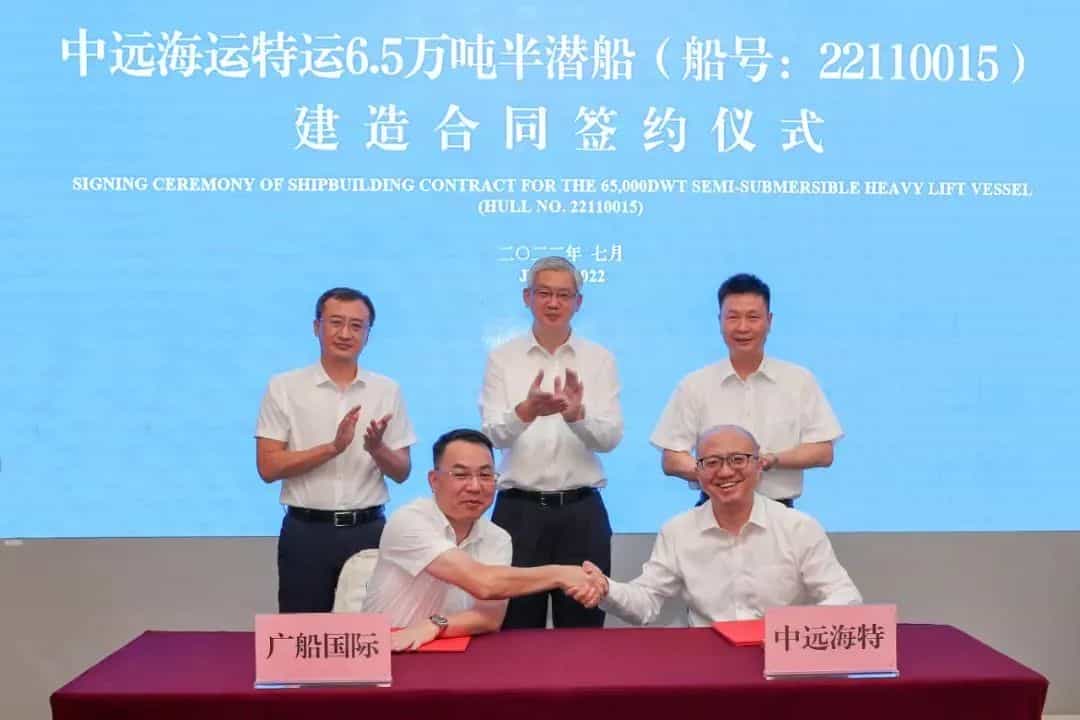 日前,廣船國際有限公司與中遠海運特種運輸股份有限公司,正式簽訂1艘6.5萬噸半潛船建造合同。