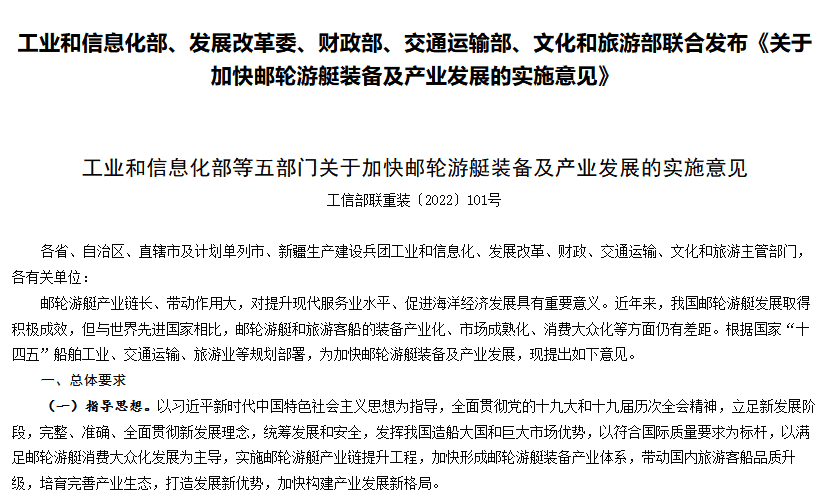 8月18日,工業和信息化部、國家發展和改革委員會、財政部、交通運輸部、文化和旅游部聯合發布《關于加快郵輪游艇裝備及產業發展的實施意見》(簡稱實施意見)。