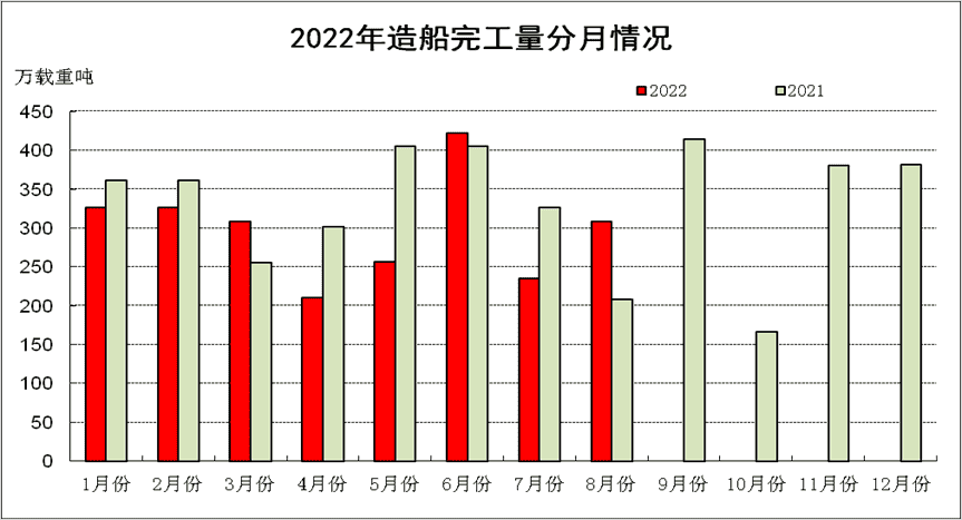 1-8月,50家重點監測的造船企業完工出口船2071萬載重噸,同比下降15.9%;承接出口船訂單2494萬載重噸,同比下降42.9%。