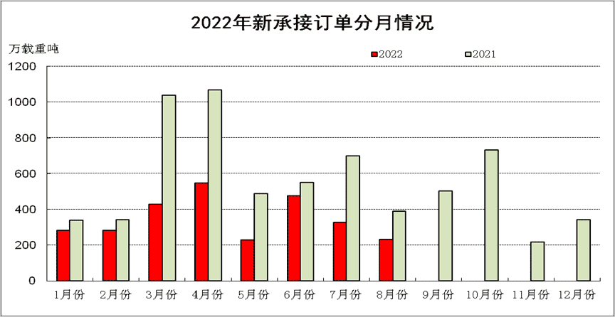 承接新船訂單2632萬載重噸,同比下降44.9%。8月底,手持船舶訂單9878萬載重噸,同比增長10.1%。