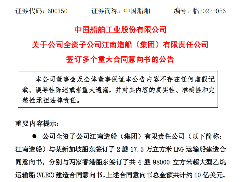 10月25日,中國船舶工業(yè)股份有限公司發(fā)布《關(guān)于公司全資子公司江南造船(集團(tuán))有限責(zé)任公司簽訂多個重大合同意向書》的公告。