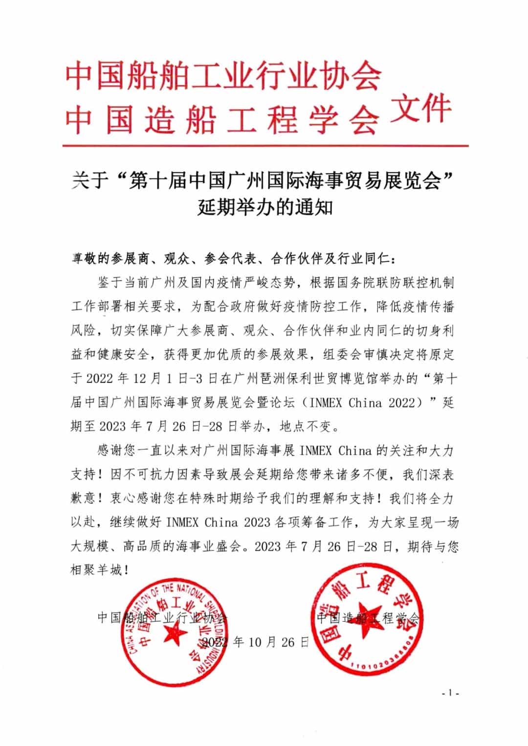 將原定于2022年12月1日-3日在廣州琶洲保利世貿(mào)博覽館舉辦的“第十屆中國(guó)廣州國(guó)際海事貿(mào)易展覽會(huì)暨論壇(INMEX China 2022)”,延期至2023年7月26日-28日舉辦,地點(diǎn)不變。