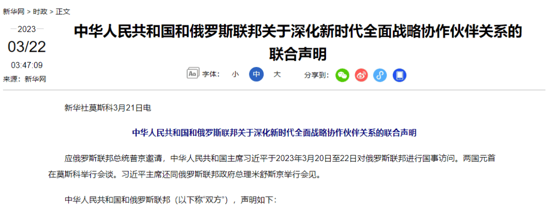 近日,《中華人民共和國和俄羅斯聯邦關于深化新時代全面戰略協作伙伴關系的聯合聲明》(簡稱聯合聲明)正式發布。