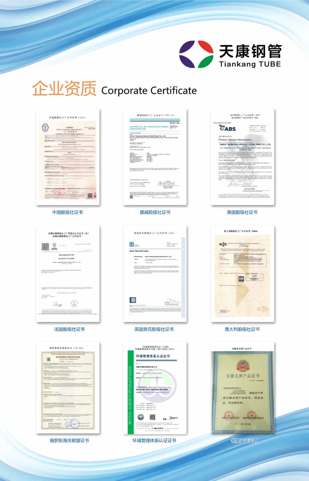 GB5310-2008,GB/T14976-2012,GB13296-2013,GB9948-2013,GB/T7219-2001,GB/T21833-2008,GB/T12771-2008,ASTM/ASMEA/SA 213,A/SA 312,A269,A268,A249,A/SA789/790,SB163,SB167,SB407,SB444,SB423,SB622,SB668,SB677,EN10216-5,DIN17456,DIN17458,JIS 3459,GOST 9941-81。