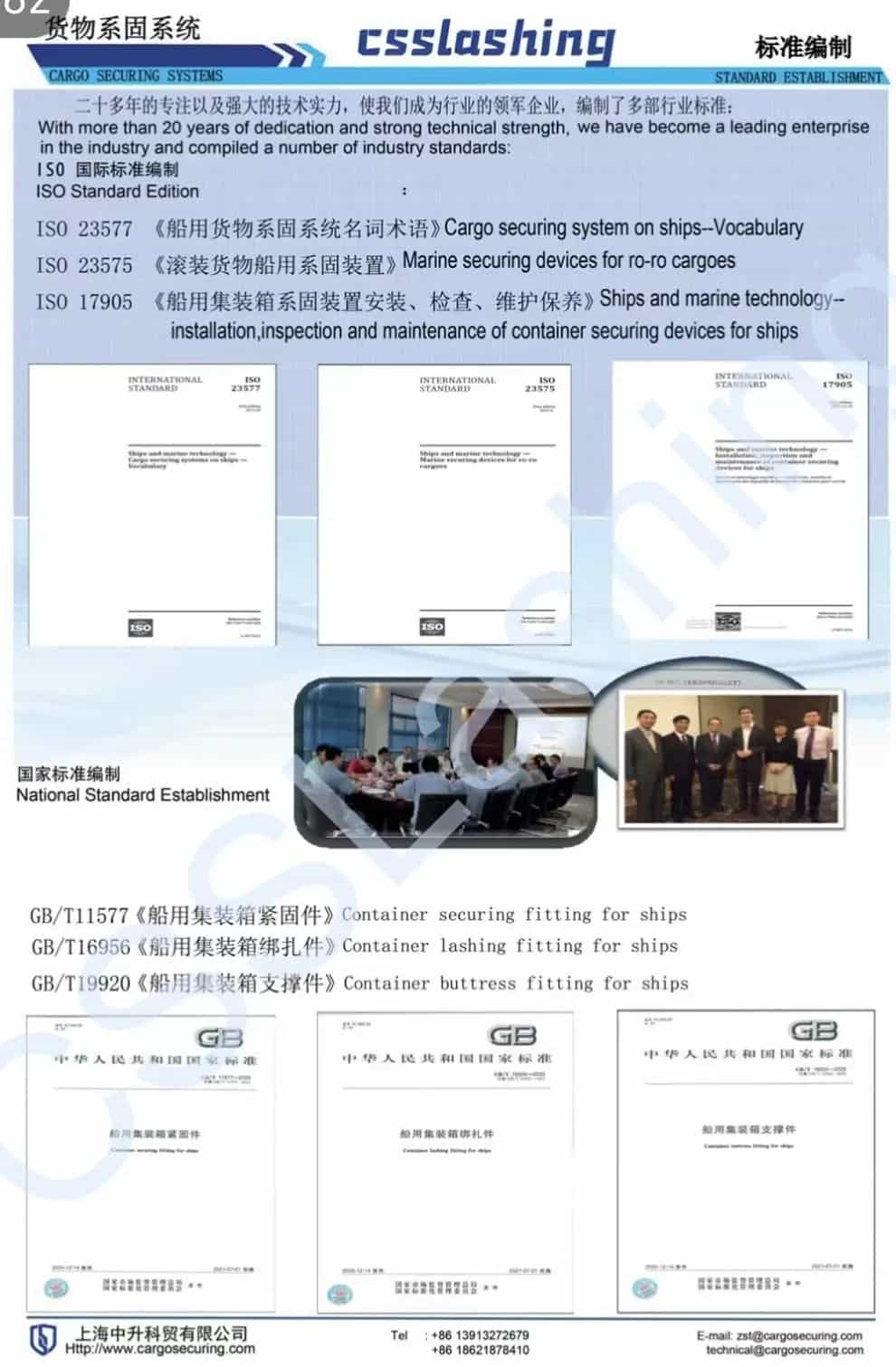公司編制及修訂多部國際標準及國家標準,如IS023577《船用貨物系固系統名詞術語》,IS023575,IS017905,GB/T11577,GB/T16956等。CSSLashing已成為國際知名品牌。