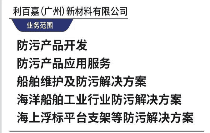 利百嘉(廣州)新材料科技有限公司(簡稱:利百嘉),是領先的海洋防污新材料研發企業,專注研發多功能環保新材料,為海洋環境保護提供技術服務和產品。