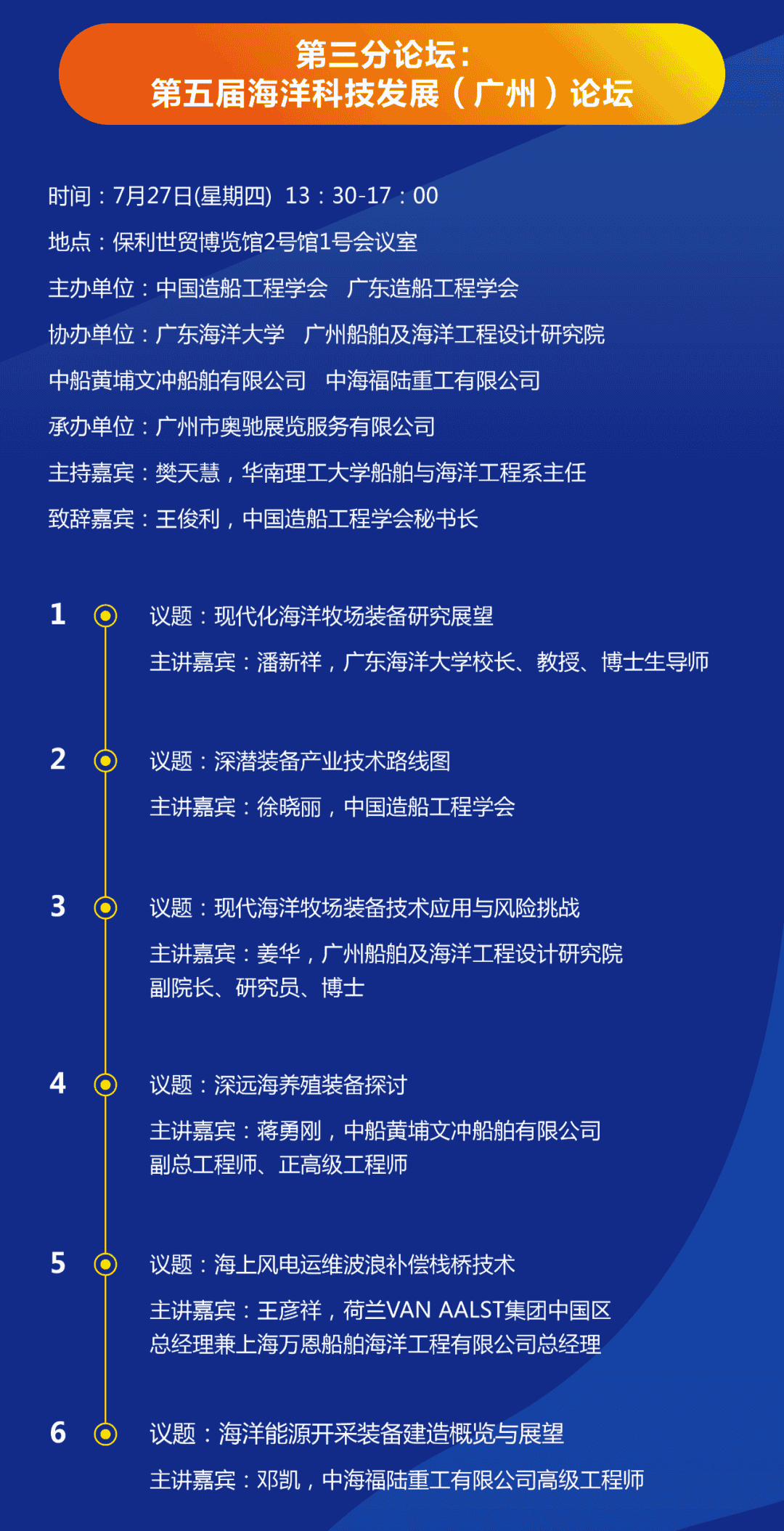7月27日13:30-17:00 ,“2023第四屆中國船舶工業轉型升級高質量發展論壇”第三分論壇--“第五屆海洋科技發展(廣州)論壇”,將于廣州琶洲保利世貿博覽館2號館1號會議室召開。