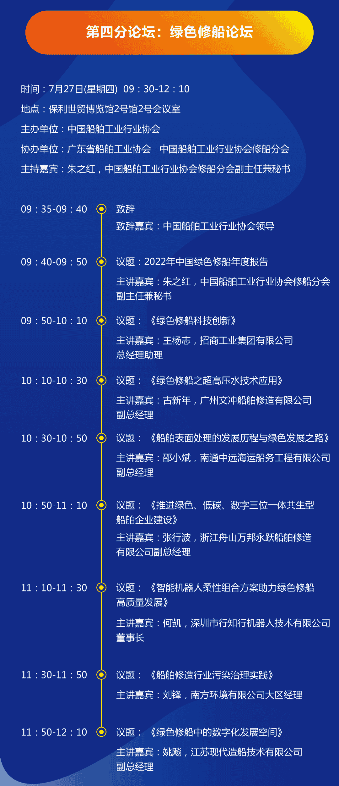 7月27日09:30-12:10 ,“2023第四屆中國船舶工業轉型升級高質量發展論壇”第四分論壇--“綠色修船論壇”,將于廣州琶洲保利世貿博覽館2號館2號會議室召開。