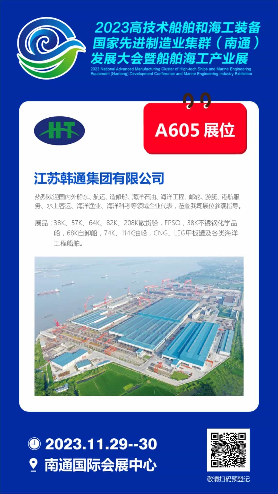 2023年11月29-30日,南通國際會展中心A605展位,韓通集團與全球船舶人相約南通,走進世界級船舶海工先進制造業集群!