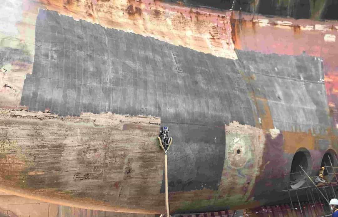 ②超高壓水除銹,環(huán)保高效,沒(méi)有粉塵,沒(méi)有垃圾散落,看不見(jiàn)水,鋼板見(jiàn)白,恢復(fù)Sa2.5級(jí)白度;