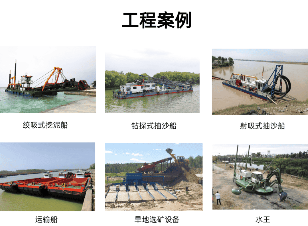 清淤疏浚船舶包括:絞吸式挖泥船、斗輪式挖泥船、射吸式抽沙船、虹吸式抽沙船、鉆探式抽沙船、鏈斗式挖沙船、水陸兩用船、挖機船、多功能工作船、自吸自卸船、運輸船等。