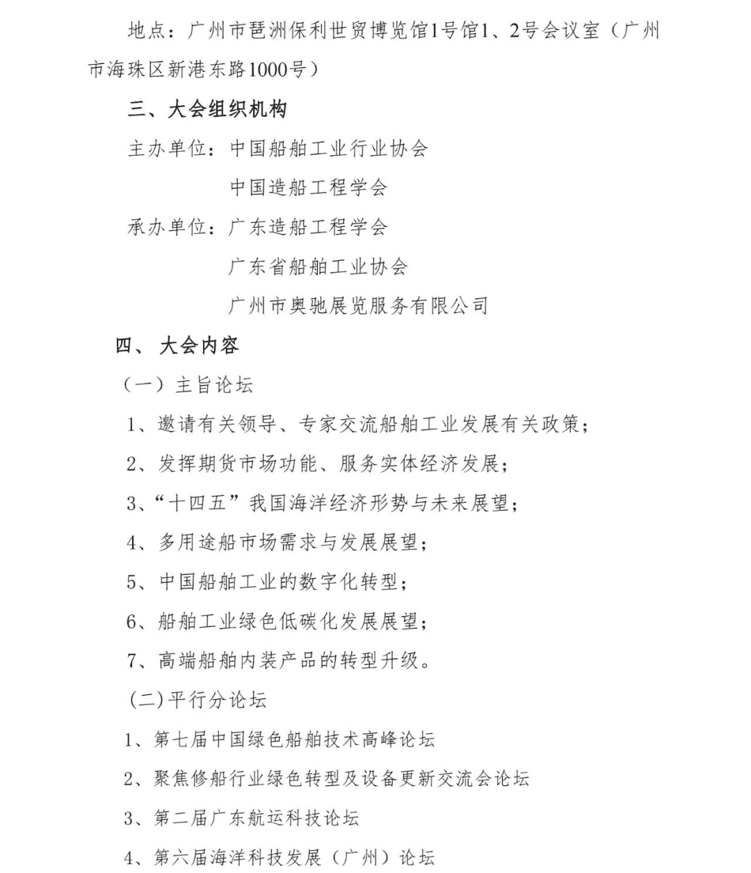 本屆論壇通過主旨論壇及七個平行分論壇進行研討和交流,平行分論壇包括第七屆中國綠色船舶技術高峰論壇、聚焦修船行業綠色轉型及設備更新交流會論壇、第二屆廣東航運科技論壇、第六屆海洋科技發展 (廣州)論壇、第三屆水下無人系統前沿科技論壇(廣州)、2024首屆中國電動船舶產業發展論壇,進一步推進船舶行業轉型升級、產業融合,增強我國船舶工業的核心競爭力。